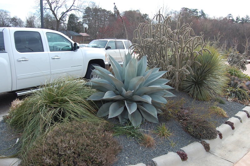 | Look! the agave has impaled that SUV! If only. The car park at the Ciener Botanic Garden. Notice the kerb insets for sempervivum. |
